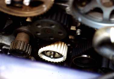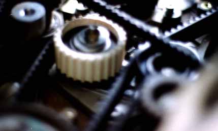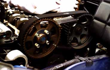 36. 新Tベルトテンショナーと新Tベルトと2本のカムシャフトとクランクシャフトがす